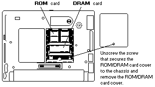 - Unscrew the single (captive) screw that secures the ROM/DRAM card compartment cover to the chassis.