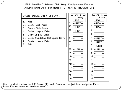 The Create/Delete/Copy Log Drive menu enables you to configure the arrays manually.