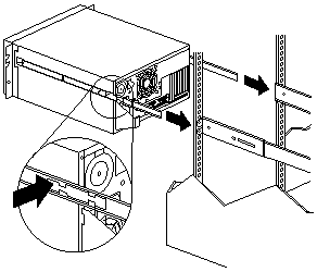 4.  Press the safety latches and slide the rack model about halfway into the rack enclosure.
